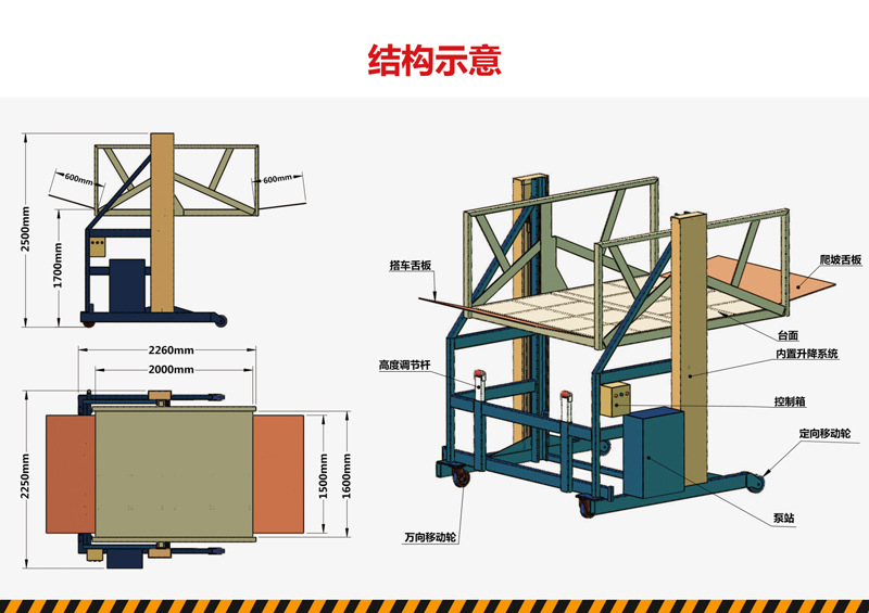 4. 安全防护:液压安全锁防意外坠落、防滑台面、防护栏 / 裙板、限位装置等。